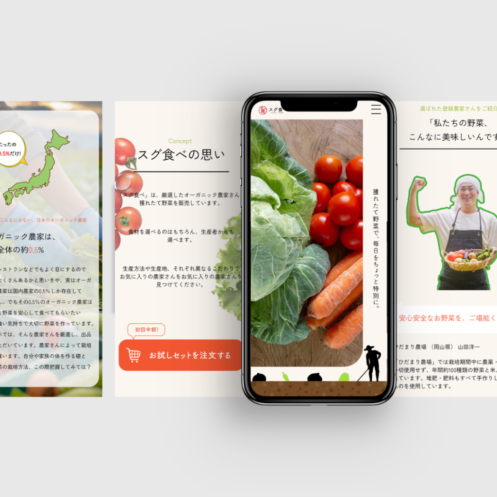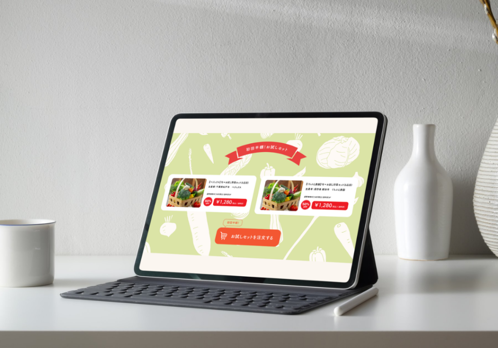 ベースカラーにはベージュを採用、フォントは筑紫A丸ゴシックを用いて、全体的に親しみやすさや柔らかい印象を演出。所々にイラストを使用して、情報の伝わりやすさと見やすさを意識しました。CVエリアは、他のセクションとの差別化のために野菜のイラスト背景を用いて目立たせました。全体のトンマナを崩さず、CVボタンや商品の値段などの重要な情報には目を引くような表現にしました。